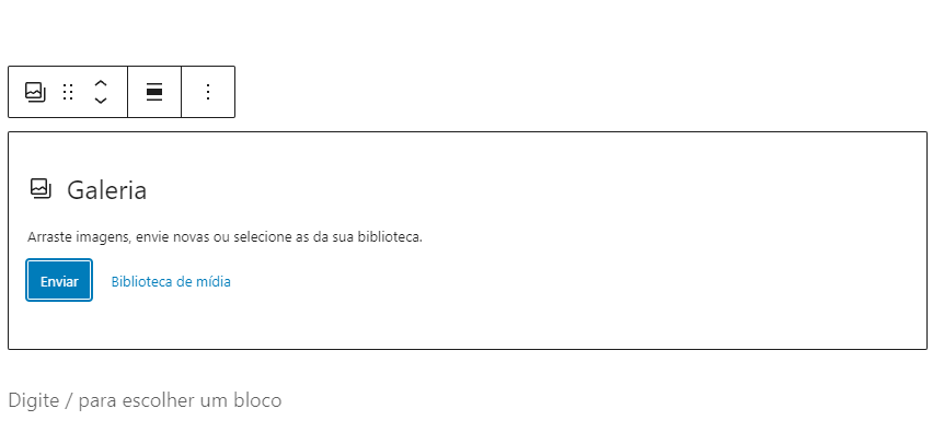 5 - Clique em Upload ou Biblioteca de mídia e selecione as imagens a ser inseridas na galeria.