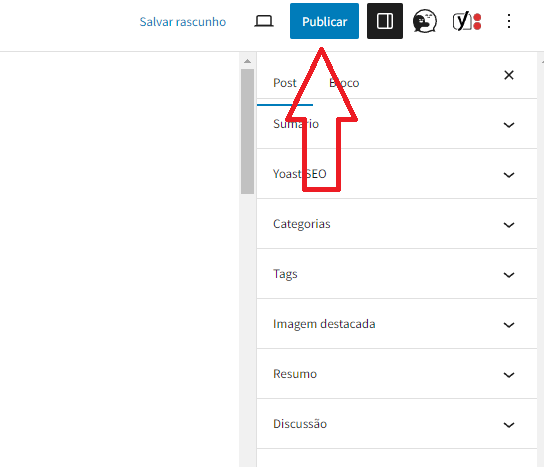 Categoria e Tags: São importantes para classificar suas postagens, no painel à direita, você pode atribuir a postagem a uma ou mais categorias e adicionar tags relevantes.