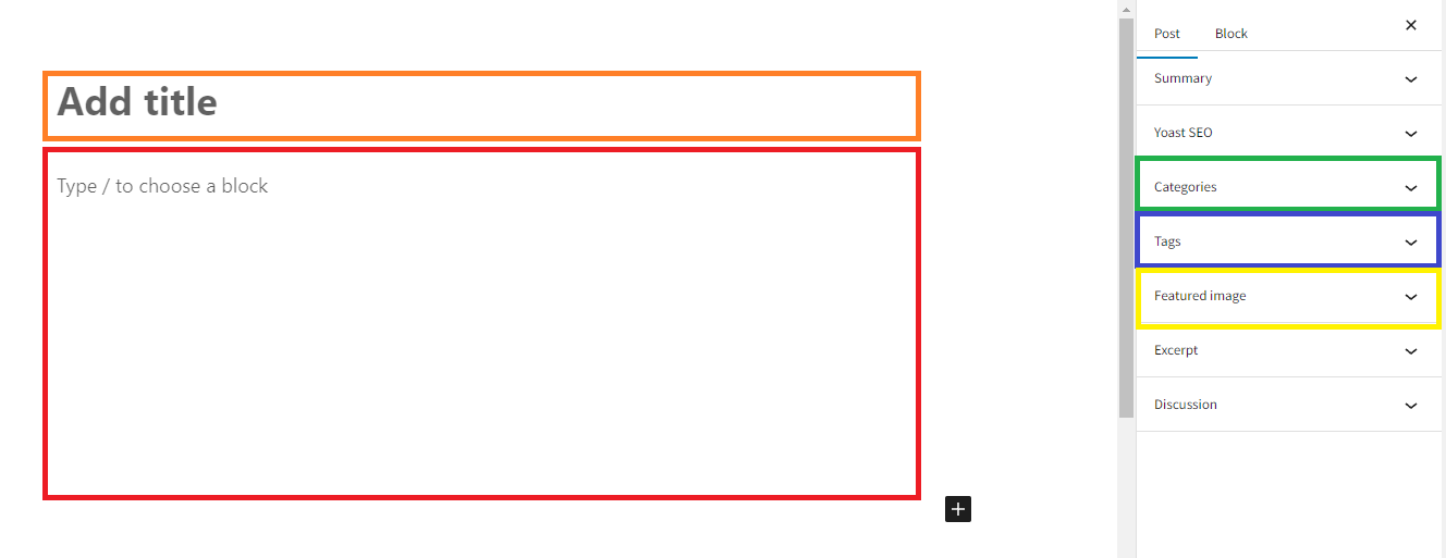 3 – Choose a title and start editing your post, see where to add each item indicated by the colors in the image:
