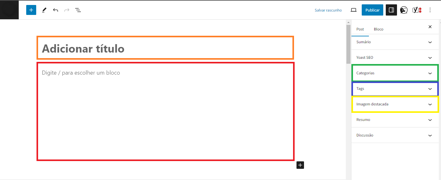 3 – Escolha um titulo e comece a editar a sua postagem, veja onde adicionar cada item indicado pelas cores na imagem:
