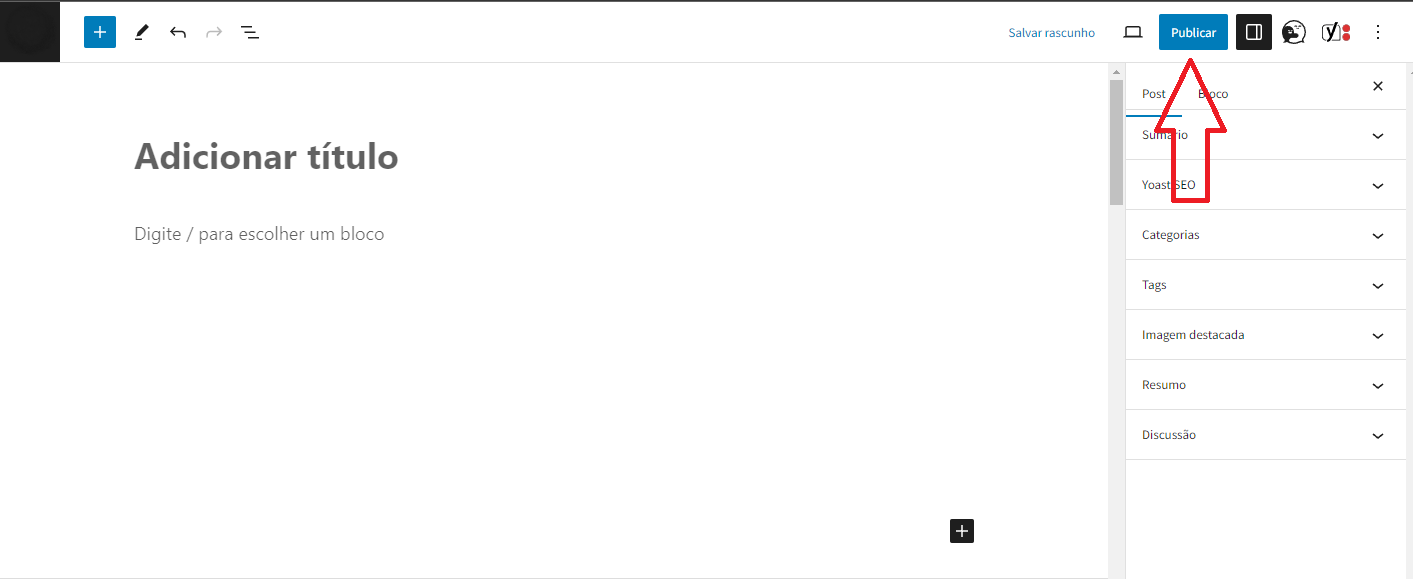 4 – Aqui iremos editar o conteúdo da nossa postagem, comece adicionando o texto e logo em seguida clique no botão +.